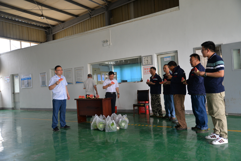 陳金華院長一行認(rèn)真察看了生產(chǎn)車間,對(duì)仍然以高昂的工作熱情堅(jiān)守崗位的一線職工表示親切的慰問,并將西瓜、飲料、毛巾和霍香正氣液等防暑降溫物品送到了一線職工的手中。