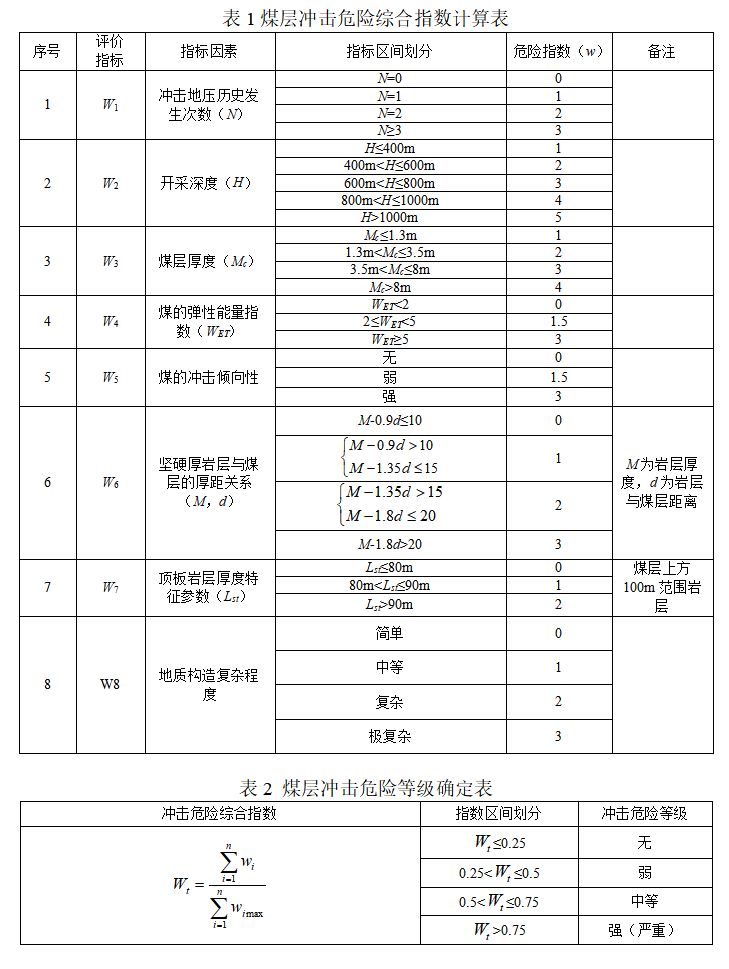 第十二條 煤層沖擊危險(xiǎn)性評(píng)價(jià)采用煤層沖擊危險(xiǎn)綜合指數(shù)法,評(píng)價(jià)結(jié)果分為四級(jí):無(wú)、弱、中等和強(qiáng)(嚴(yán)重)沖擊地壓危險(xiǎn)。
