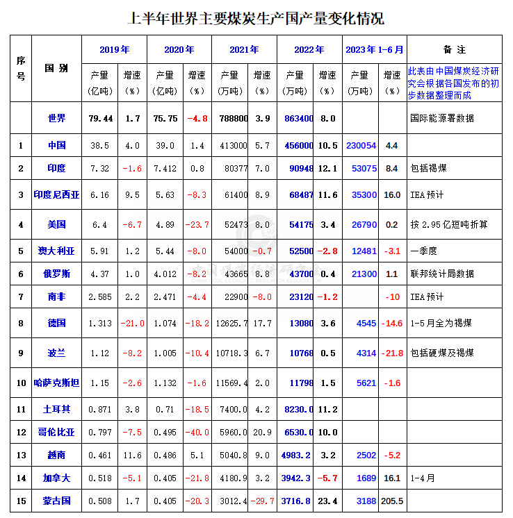 2023年上半年世界主要煤炭生產(chǎn)國(guó)產(chǎn)量變化情況