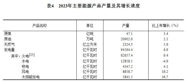 初步核算,全年一次能源生產(chǎn)總量48.3億噸標(biāo)準(zhǔn)煤,比上年增長4.2%。其中,生產(chǎn)原煤4 7.1億噸,增長3.4%;原油20902.6萬噸,增長2.1%;天然氣2324.3億立方米,增長5.6%;發(fā)電量94564.4億千瓦時(shí),增長6.9。