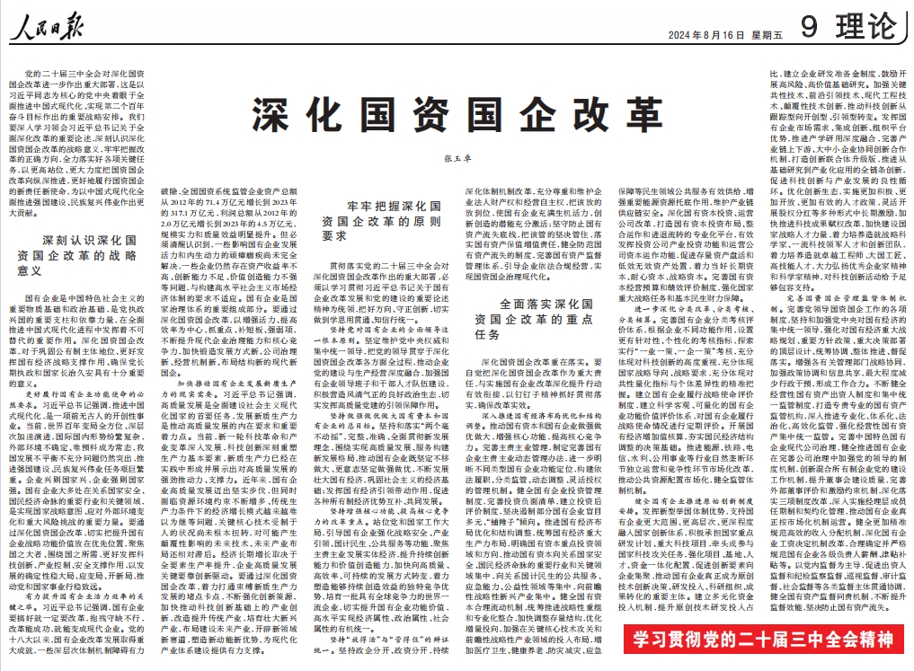 黨的二十屆三中全會對深化國資國企改革進一步作出重大部署,這是以習(xí)近平同志為核心的黨中央著眼于全面推進中國式現(xiàn)代化、實現(xiàn)第二個百年奮斗目標(biāo)作出的重要戰(zhàn)略安排。我們要深入學(xué)習(xí)領(lǐng)會習(xí)近平總書記關(guān)于全面深化改革的重要論述,深刻認(rèn)識深化國資國企改革的戰(zhàn)略意義,牢牢把握改革的正確方向,全力落實好各項關(guān)鍵任務(wù),以更高站位、更大力度把國資國企改革向縱深推進,更好地履行國資國企的新責(zé)任新使命,為以中國式現(xiàn)代化全面推進強國建設(shè)、民族復(fù)興偉業(yè)作出更大貢獻。
